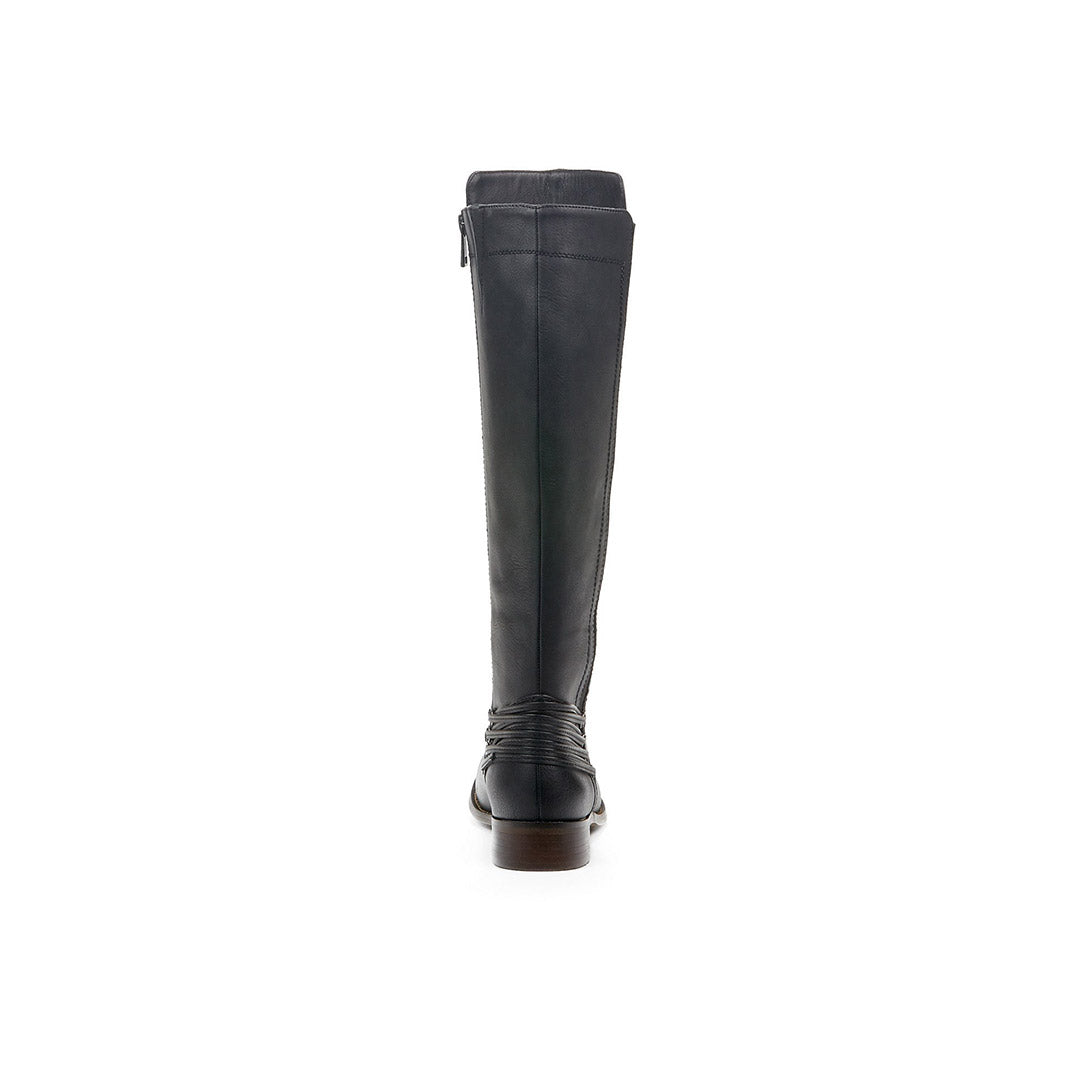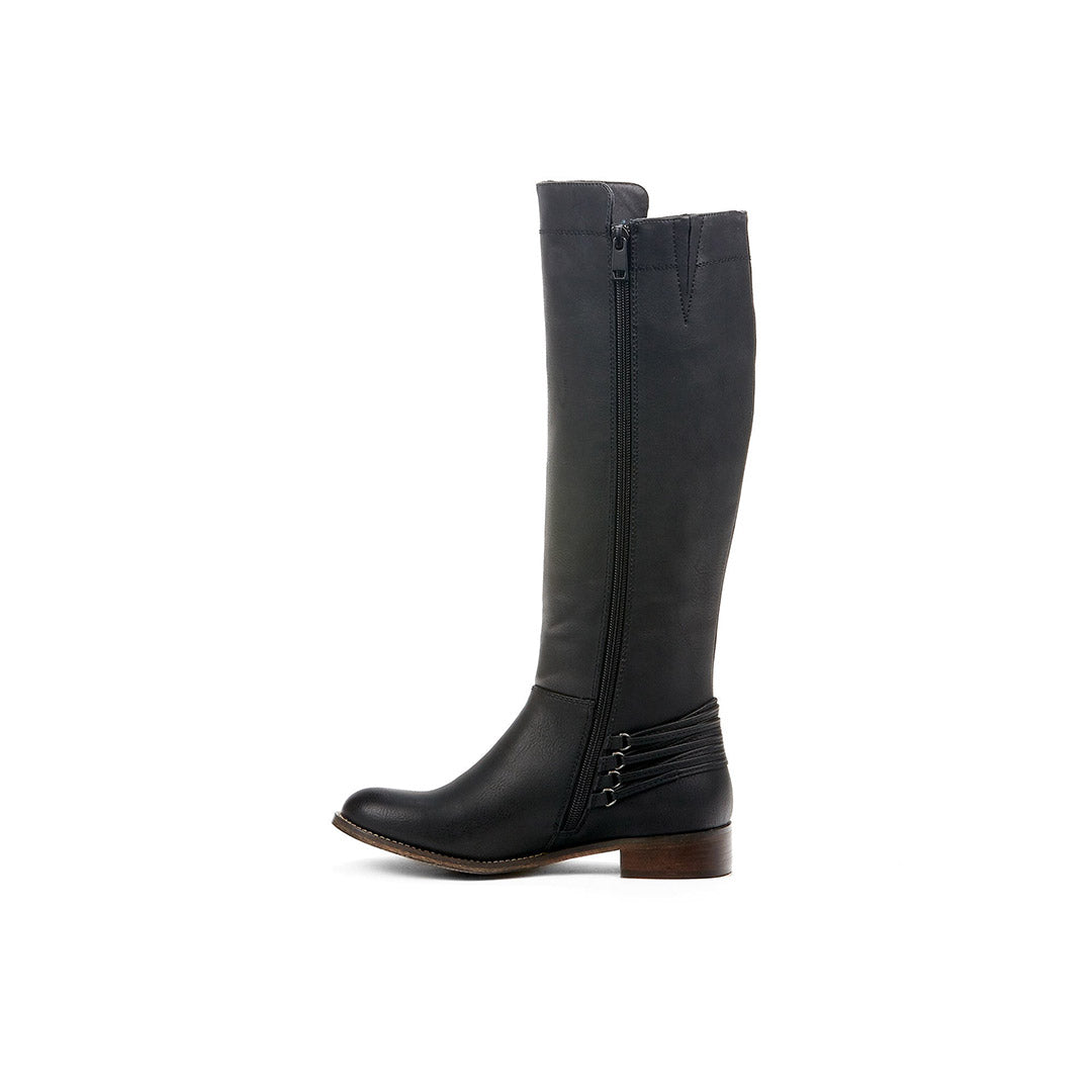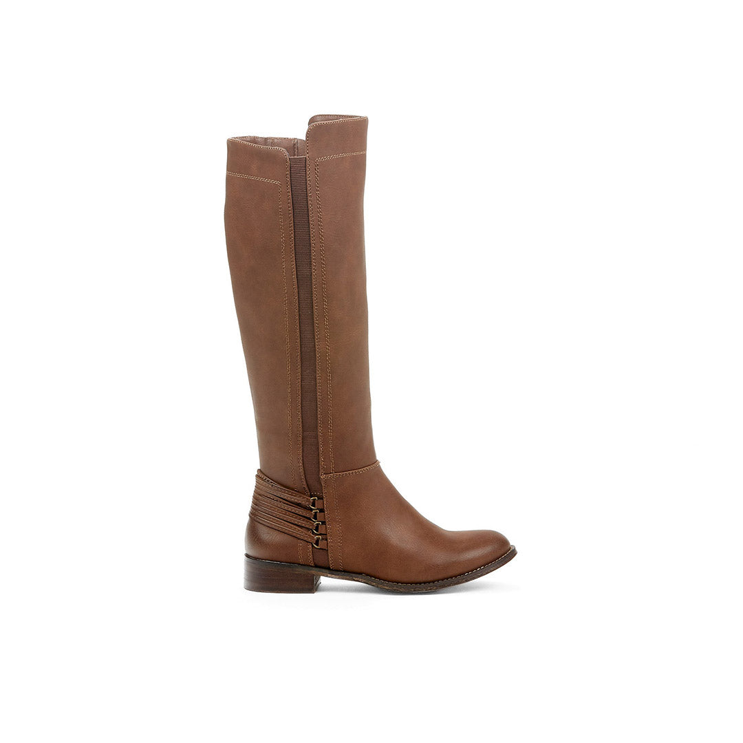 Cette botte haute à petit talon pour femmes regorge de style avec son détail de laçage de type corset.